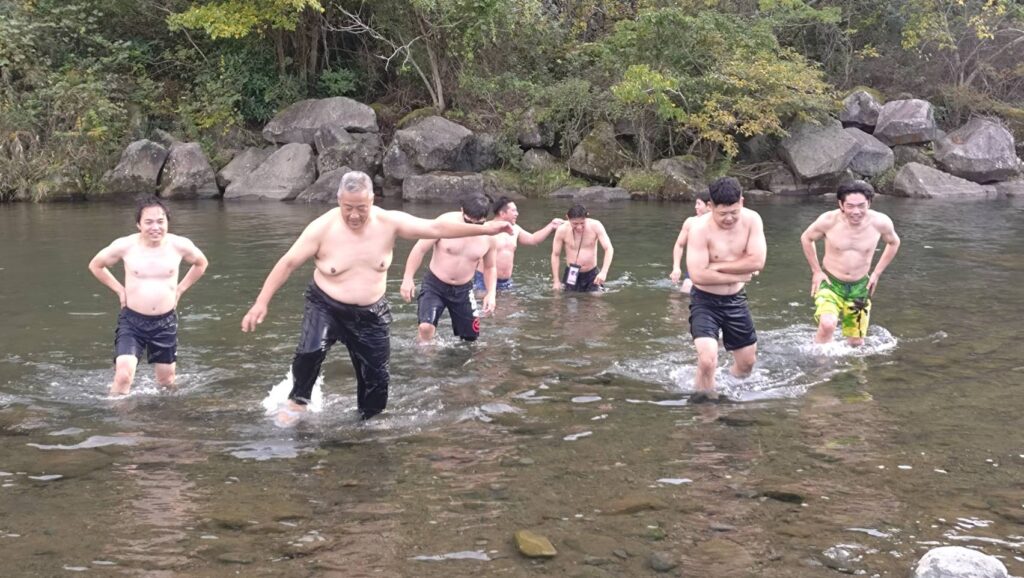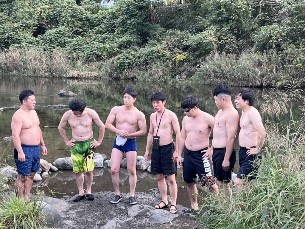 焚火で熱くなってきたら、川に入りましょう!